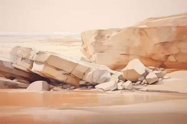 Poster Minimalistische felsige Strandlandschaft mit großen hellbraunen Felsblöcken und klarem Wasser Nr f44865
