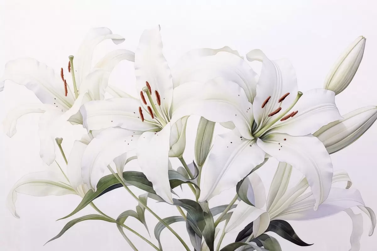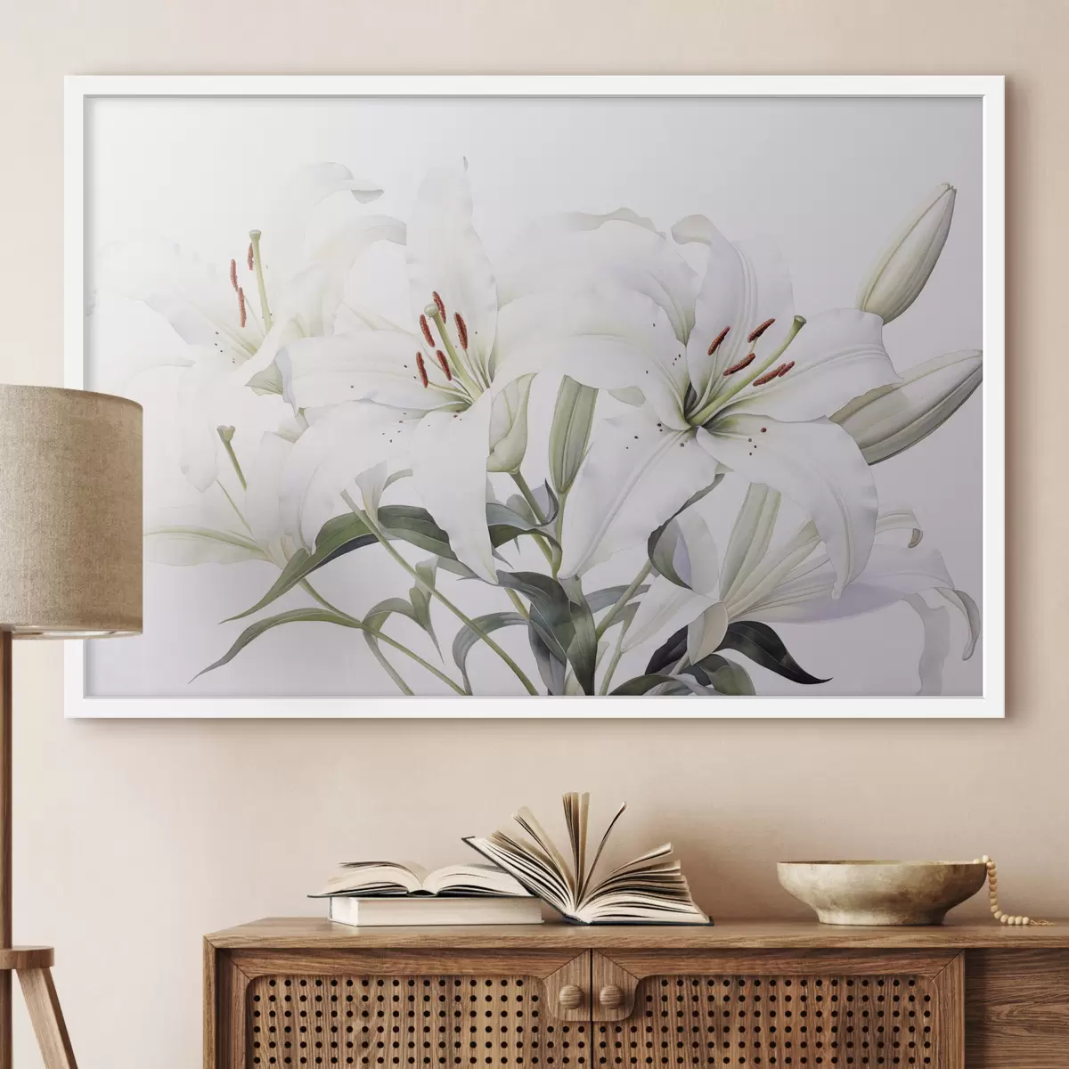 Poster Ein Strauß weißer Lilien mit grünen Blättern, zarten Blütenblättern und weichem weißen Hintergrund f44868