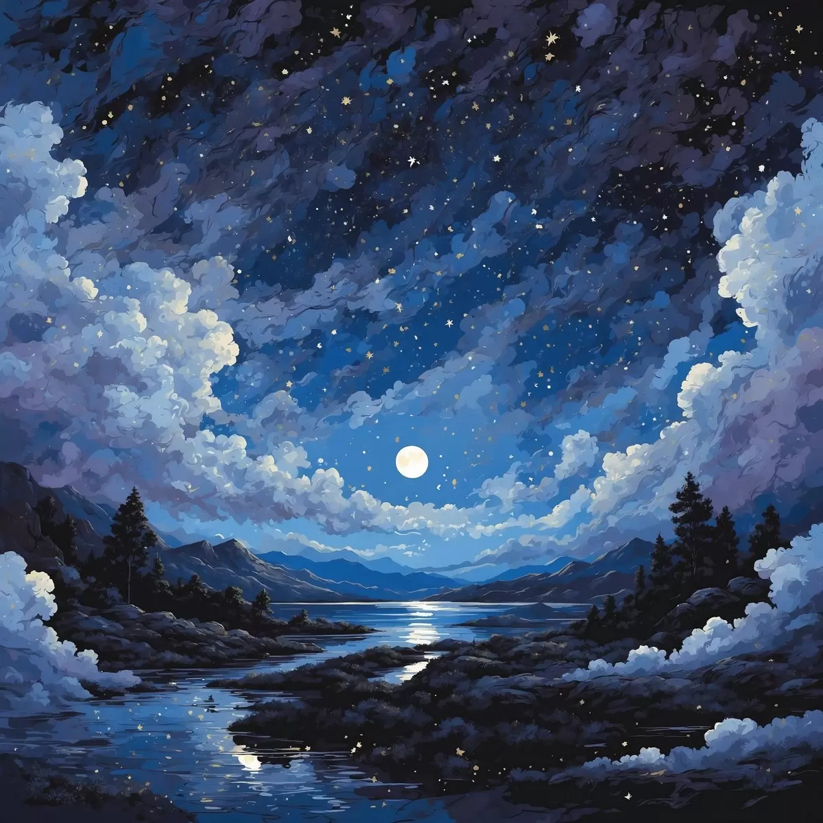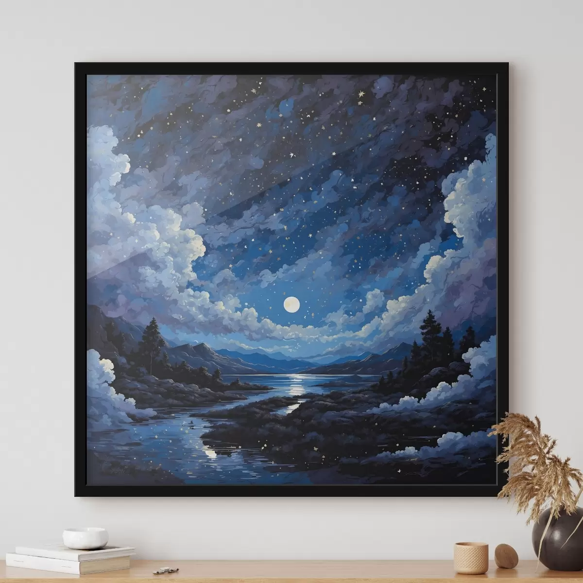 Poster Nachthimmel mit Mond und Sternen über einer Berglandschaft Nr f44872