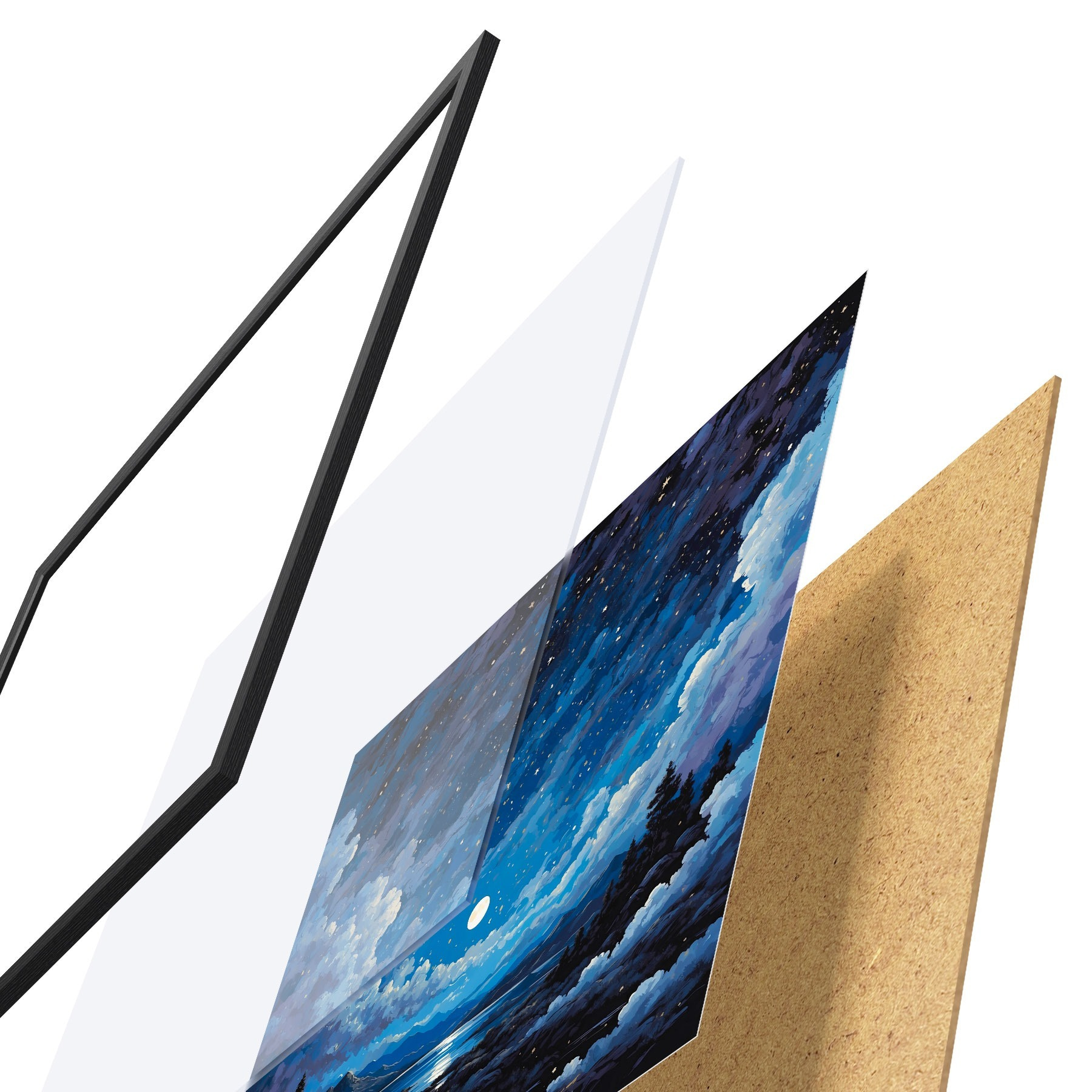Das Poster besteht aus einem Rahmen, Plexiglas, einem gedruckten Bild und einer Rückwand aus Spanplatten. Dank der Halterungen auf der Rückseite kann das Poster sofort an die Wand gehängt werden.
