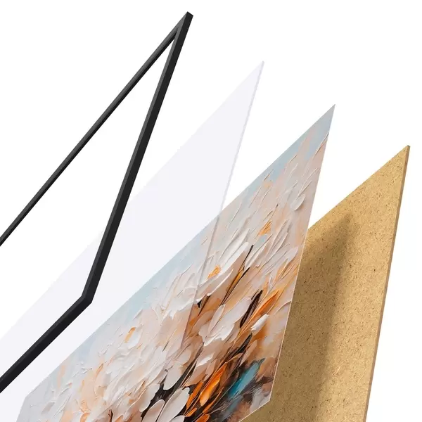 Das Poster besteht aus einem Rahmen, Plexiglas, einem gedruckten Bild und einer Rückwand aus Spanplatten. Dank der Halterungen auf der Rückseite kann das Poster sofort an die Wand gehängt werden.