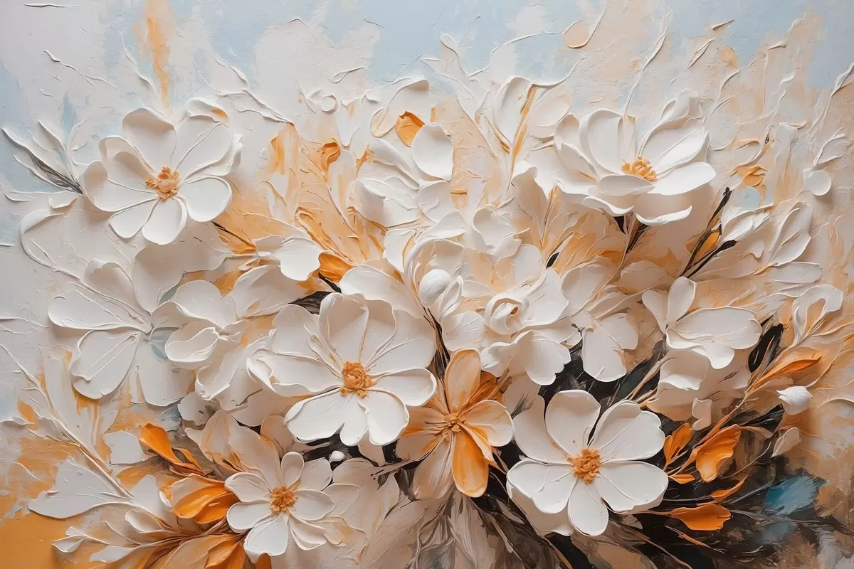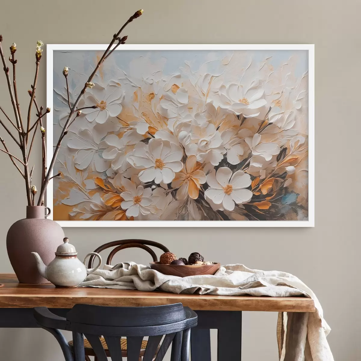 Poster Weiße und pfirsichfarbene Blumen auf blauem Hintergrund mit Pastellfarben f44879