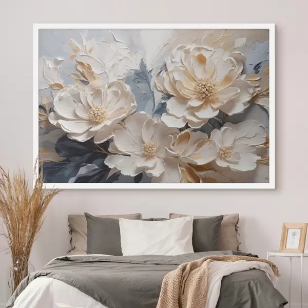 Poster Volumetrische cremefarbene Pfingstrosen auf einem hellblauen Hintergrund Nr f44880