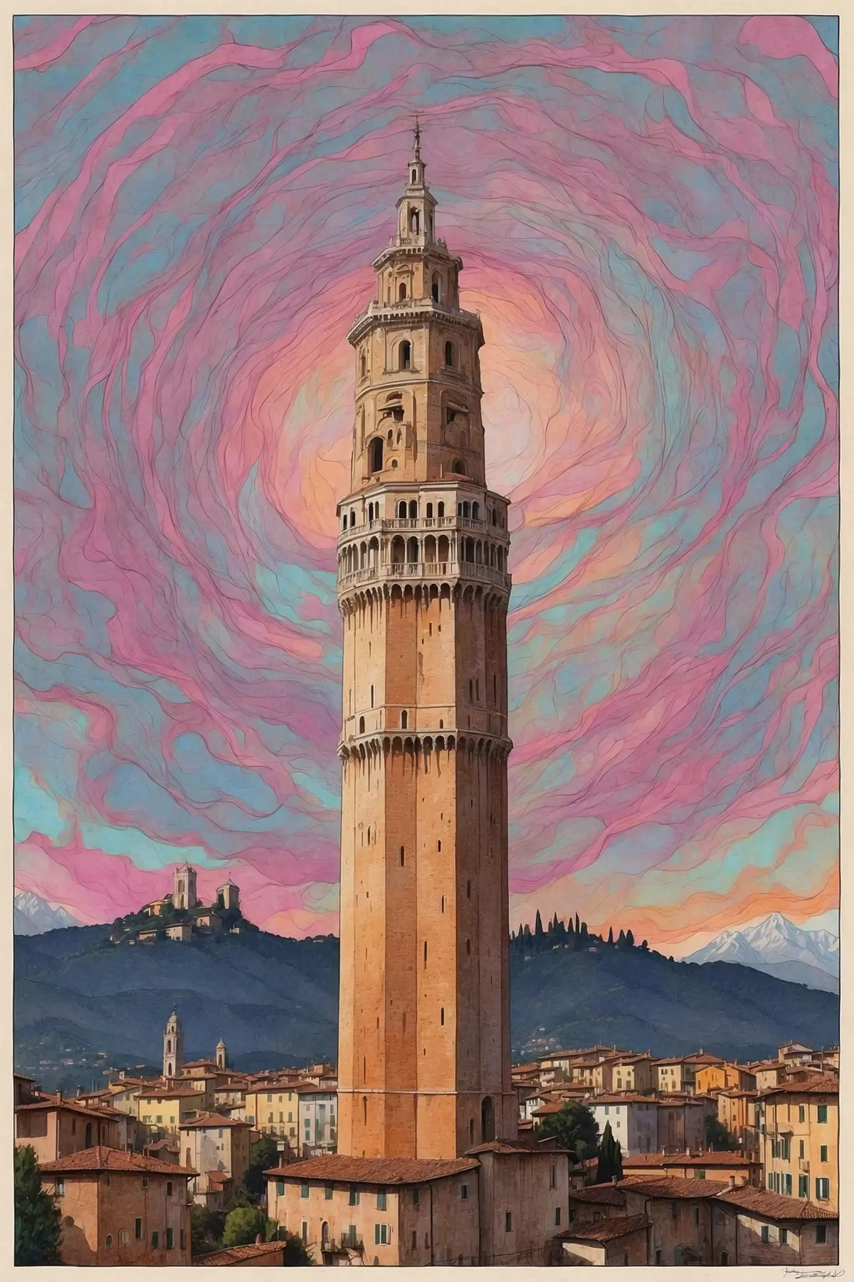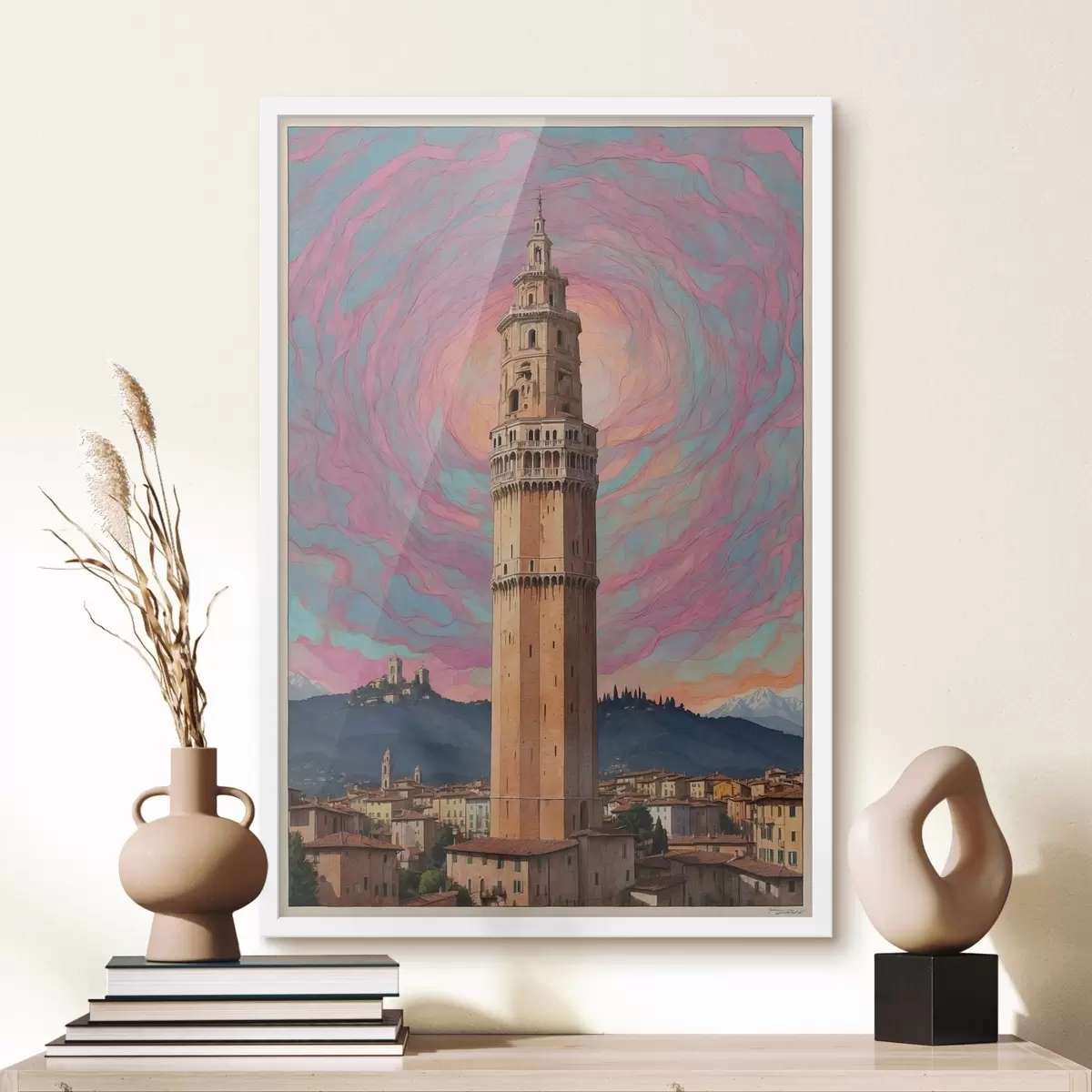 Poster Fantasieturm gegen den Himmel mit rosa und blauen Spiralen Nr f44885