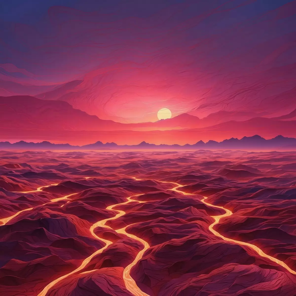 Poster Heiße Landschaft mit Lavaströmen unter einem roten Himmel Nr f44886