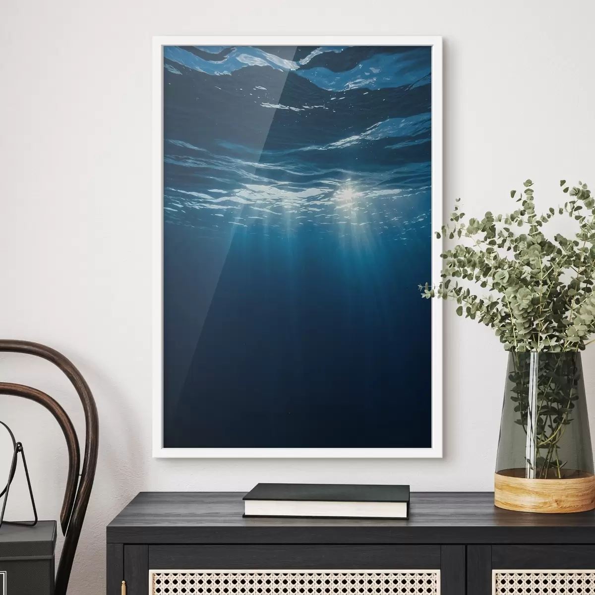 Poster Lichtstrahlen unter Wasser im tiefblauen Ozean f44897