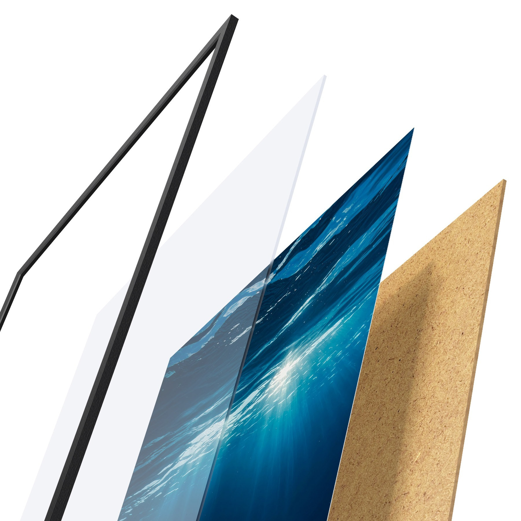 Das Poster besteht aus einem Rahmen, Plexiglas, einem gedruckten Bild und einer Rückwand aus Spanplatten. Dank der Halterungen auf der Rückseite kann das Poster sofort an die Wand gehängt werden.