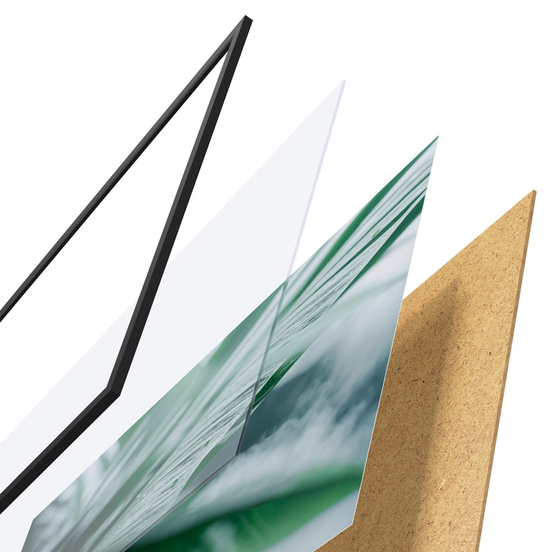Das Poster besteht aus einem Rahmen, Plexiglas, einem gedruckten Bild und einer Rückwand aus Spanplatten. Dank der Halterungen auf der Rückseite kann das Poster sofort an die Wand gehängt werden.