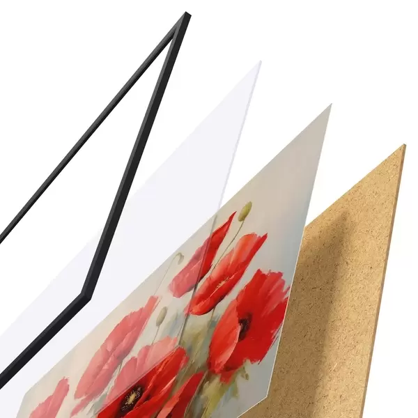 Das Poster besteht aus einem Rahmen, Plexiglas, einem gedruckten Bild und einer Rückwand aus Spanplatten. Dank der Halterungen auf der Rückseite kann das Poster sofort an die Wand gehängt werden.