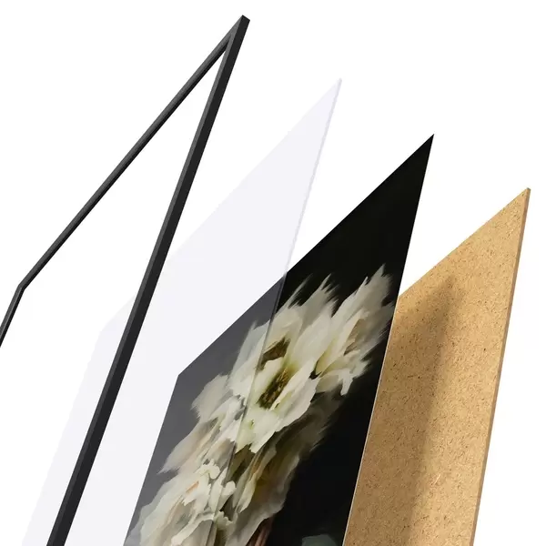 Das Poster besteht aus einem Rahmen, Plexiglas, einem gedruckten Bild und einer Rückwand aus Spanplatten. Dank der Halterungen auf der Rückseite kann das Poster sofort an die Wand gehängt werden.