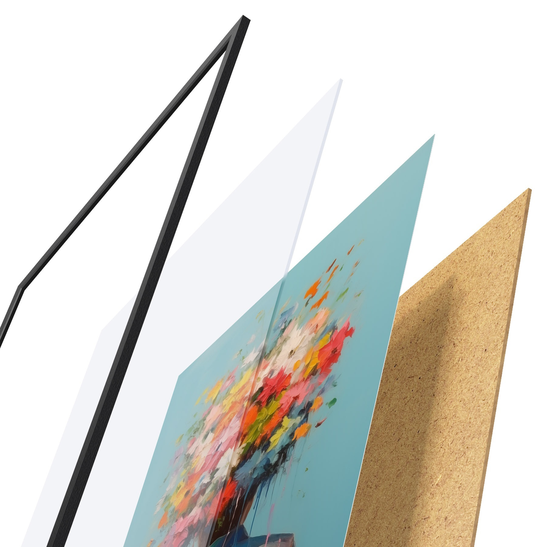 Das Poster besteht aus einem Rahmen, Plexiglas, einem gedruckten Bild und einer Rückwand aus Spanplatten. Dank der Halterungen auf der Rückseite kann das Poster sofort an die Wand gehängt werden.