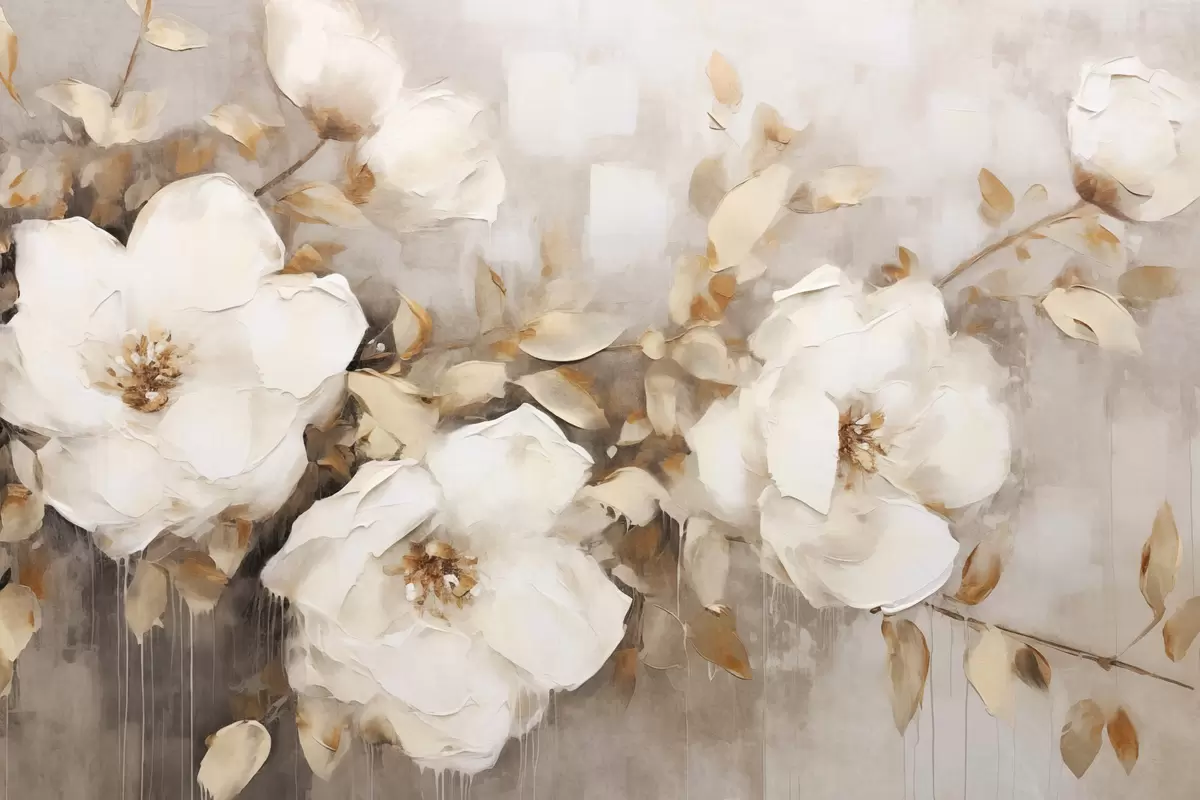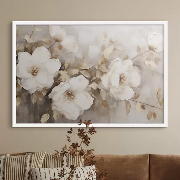 Poster Weiße Blumen mit braunen Blättern in einem beigen Hintergrund, Ölgemälde Nachahmung, Blumenarrangement, botanische Kunst Nr f44922