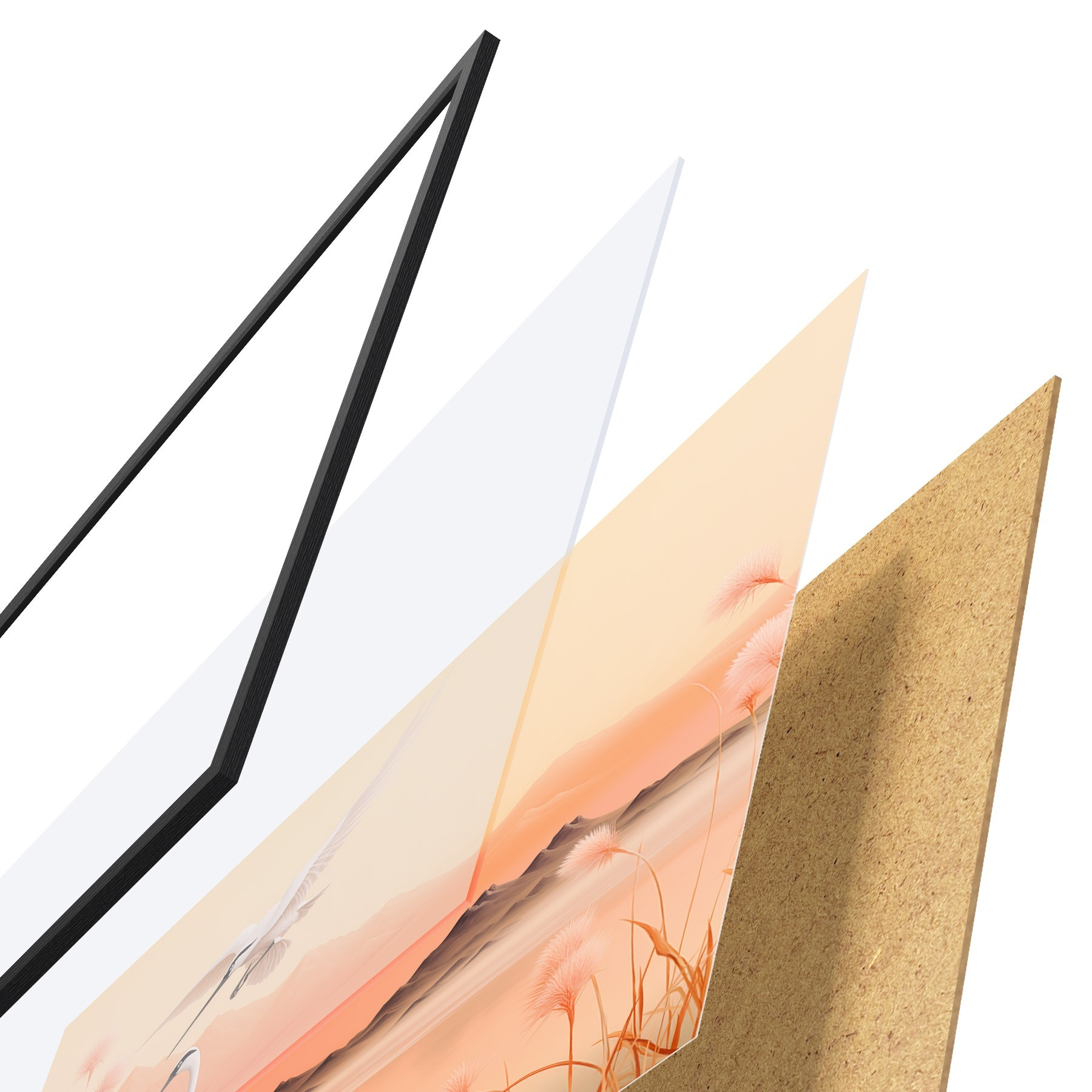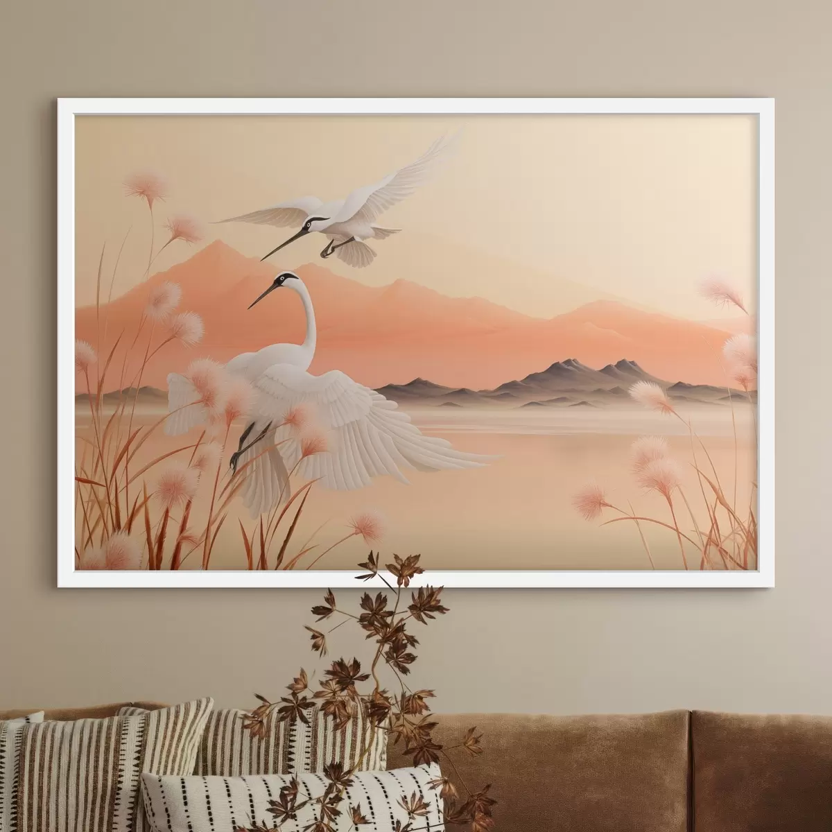 Poster Weiße Kraniche mit rosa Schilf im Vordergrund, Berge und ein See im Hintergrund, weiches orangefarbenes Licht Nr f44925