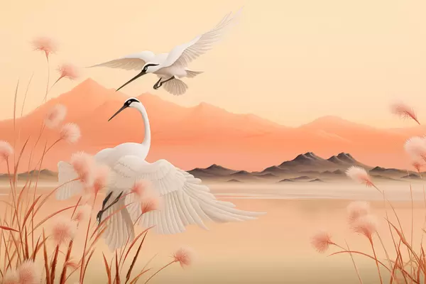 Poster Weiße Kraniche mit rosa Schilf im Vordergrund, Berge und ein See im Hintergrund, weiches orangefarbenes Licht f44925