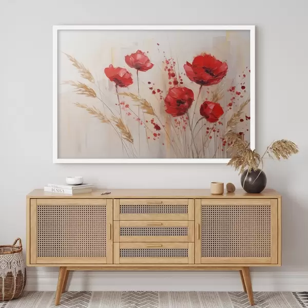 Poster Rote Mohnblumen mit gelben Weizenhalmen, vor einem weichen, neutralen Hintergrund mit roten Farbspritzern Nr f44926