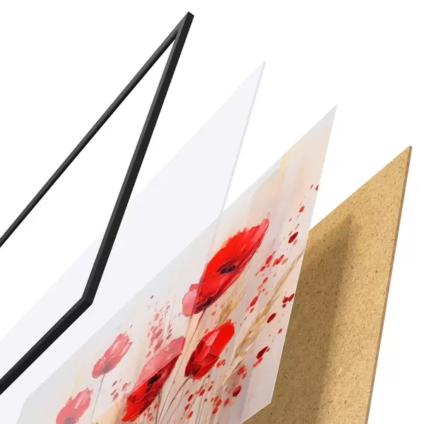 Das Poster besteht aus einem Rahmen, Plexiglas, einem gedruckten Bild und einer Rückwand aus Spanplatten. Dank der Halterungen auf der Rückseite kann das Poster sofort an die Wand gehängt werden.