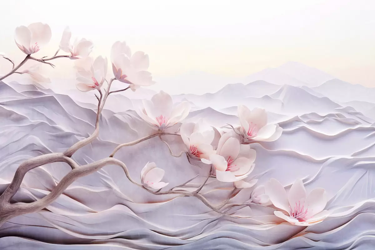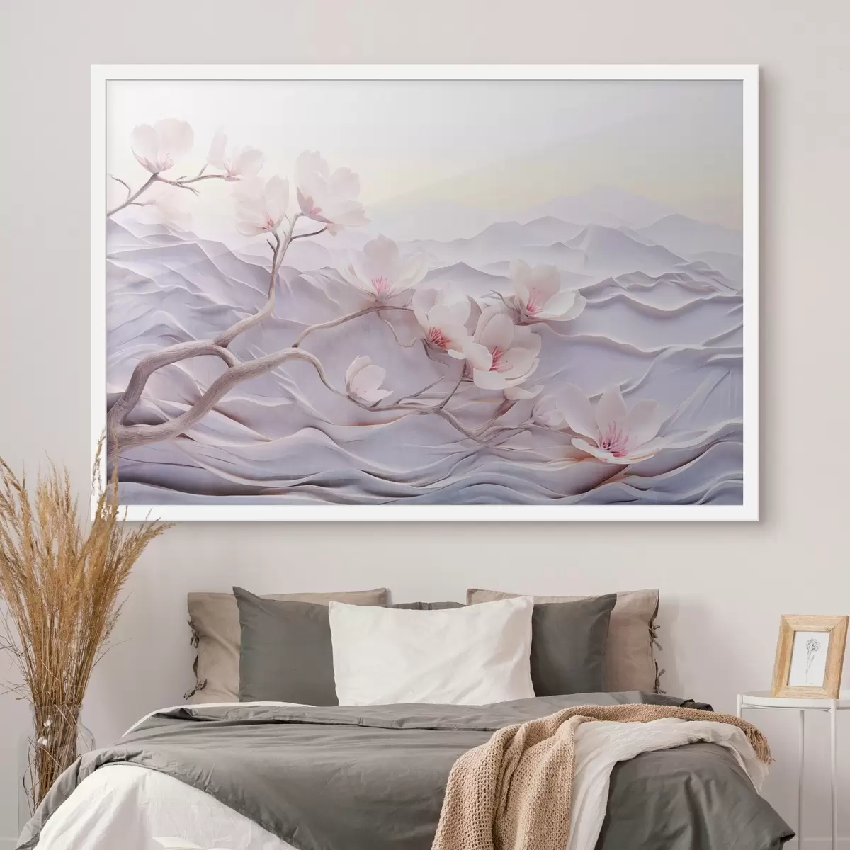 Poster Blütenzweig mit rosa Blumen, Berge im Hintergrund, weiche Pastellfarben, japanische Strukturkunst f44930
