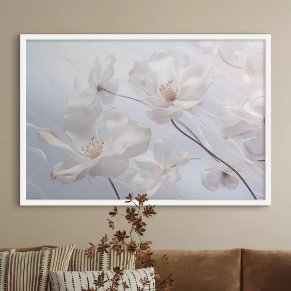 Poster Weiße Blumen mit durchscheinenden Blütenblättern, weicher hellblauer Hintergrund, elegant, romantisch, zart, verträumt f44931