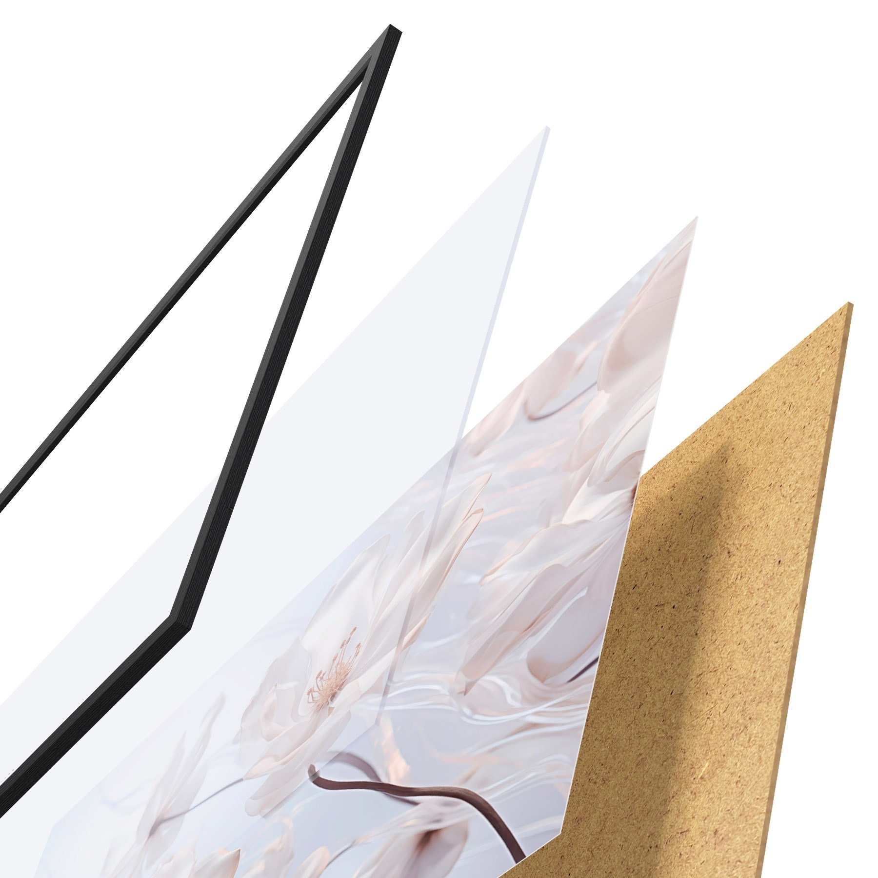 Das Poster besteht aus einem Rahmen, Plexiglas, einem gedruckten Bild und einer Rückwand aus Spanplatten. Dank der Halterungen auf der Rückseite kann das Poster sofort an die Wand gehängt werden.