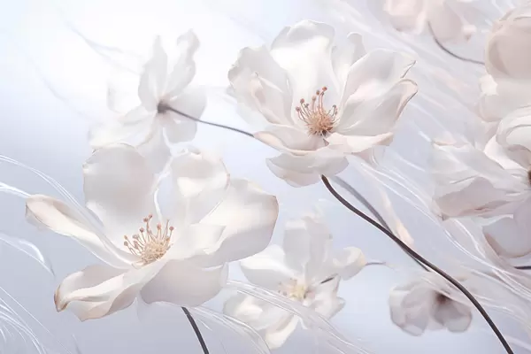 Poster Weiße Blumen mit durchscheinenden Blütenblättern, weicher hellblauer Hintergrund, elegant, romantisch, zart, verträumt f44931