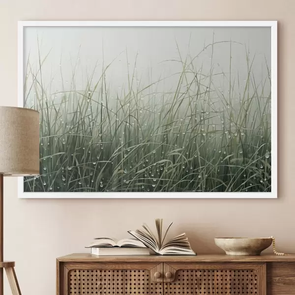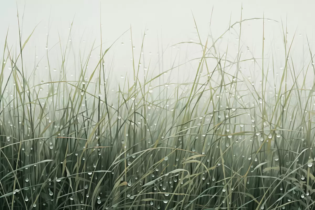 Poster Gras mit Wassertropfen, Grüntöne, weiches Licht, nebliger Hintergrund, abstrakter minimalistischer strukturierter Stil f44932