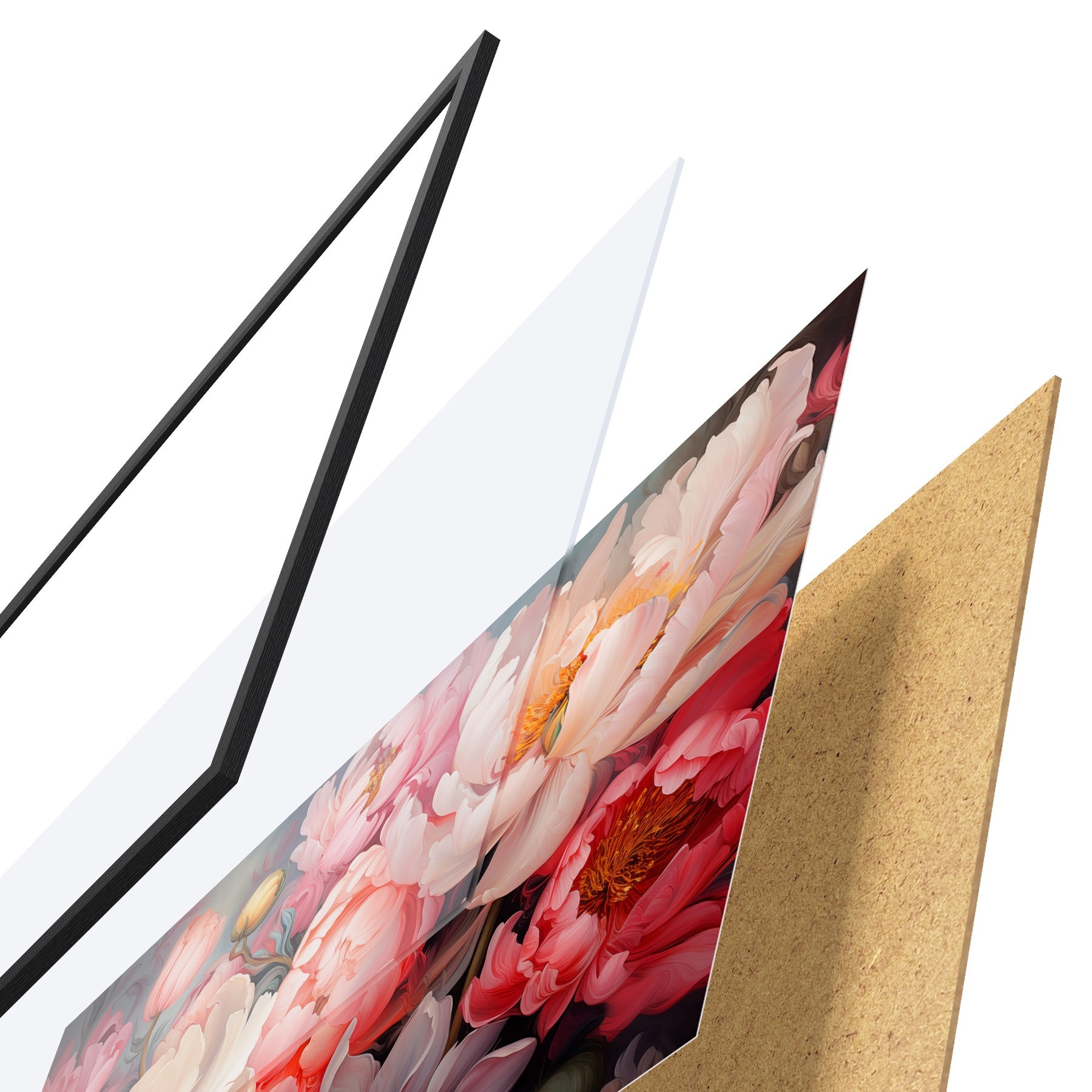 Das Poster besteht aus einem Rahmen, Plexiglas, einem gedruckten Bild und einer Rückwand aus Spanplatten. Dank der Halterungen auf der Rückseite kann das Poster sofort an die Wand gehängt werden.