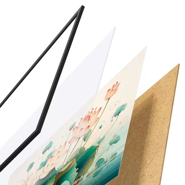 Das Poster besteht aus einem Rahmen, Plexiglas, einem gedruckten Bild und einer Rückwand aus Spanplatten. Dank der Halterungen auf der Rückseite kann das Poster sofort an die Wand gehängt werden.