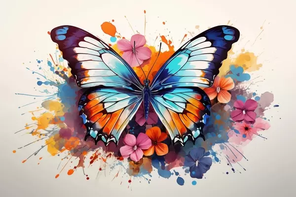 Poster Dynamische Komposition eines Schmetterlings und floralen Flecken im Kunststil f44943