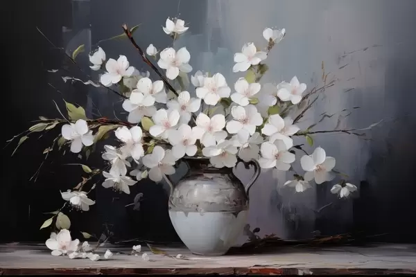 Poster Blühende Zweige in einer Vase auf einem dunklen Hintergrund im malerischen Stil Nr f44949