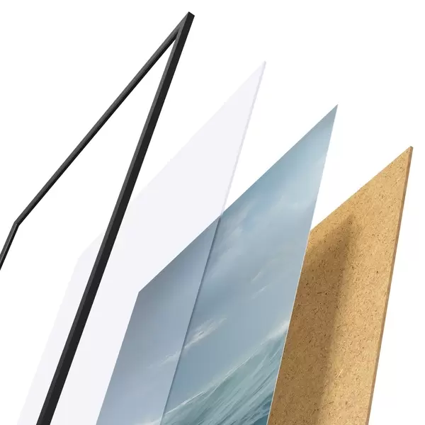Das Poster besteht aus einem Rahmen, Plexiglas, einem gedruckten Bild und einer Rückwand aus Spanplatten. Dank der Halterungen auf der Rückseite kann das Poster sofort an die Wand gehängt werden.