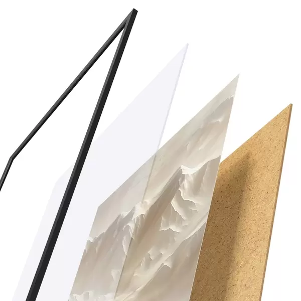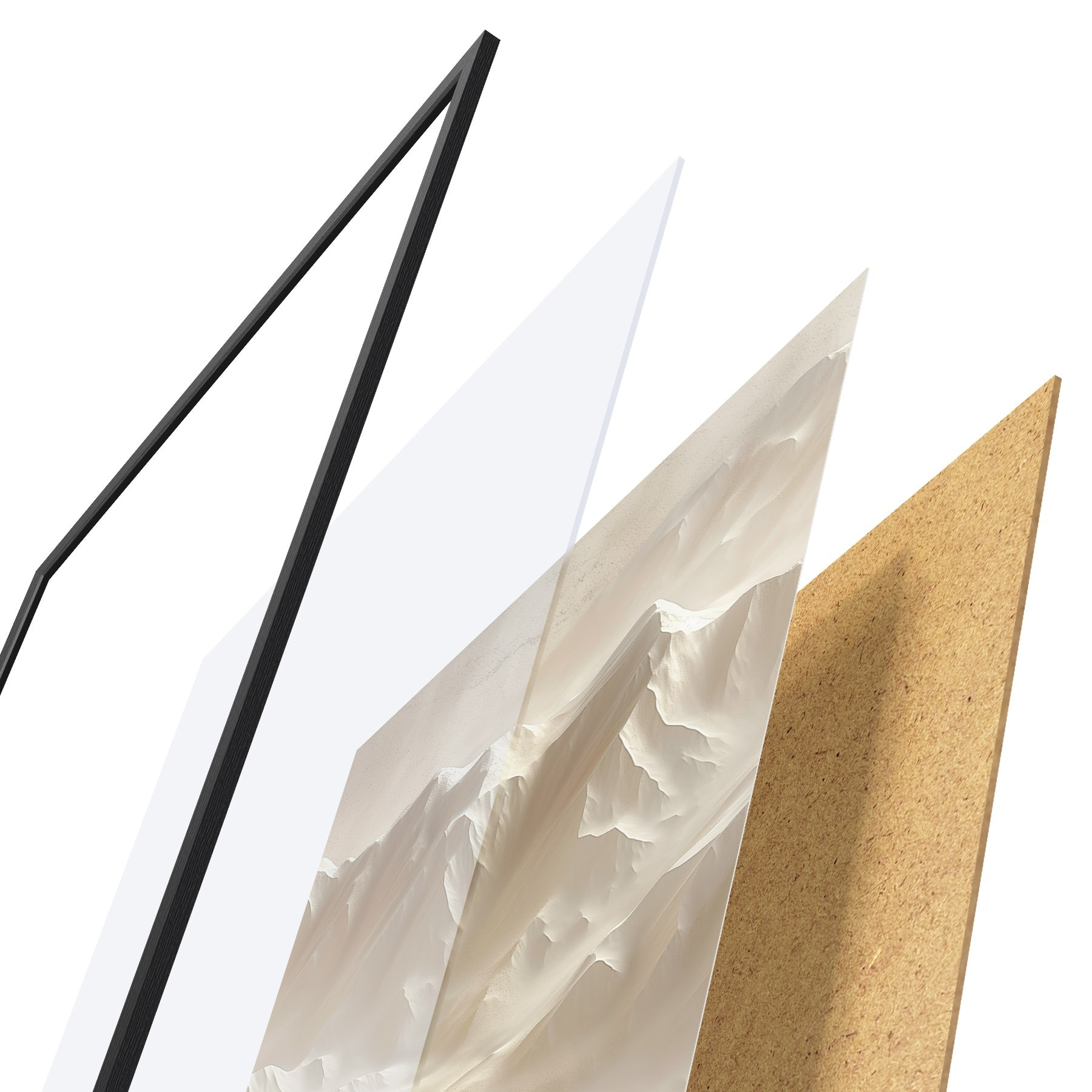 Das Poster besteht aus einem Rahmen, Plexiglas, einem gedruckten Bild und einer Rückwand aus Spanplatten. Dank der Halterungen auf der Rückseite kann das Poster sofort an die Wand gehängt werden.
