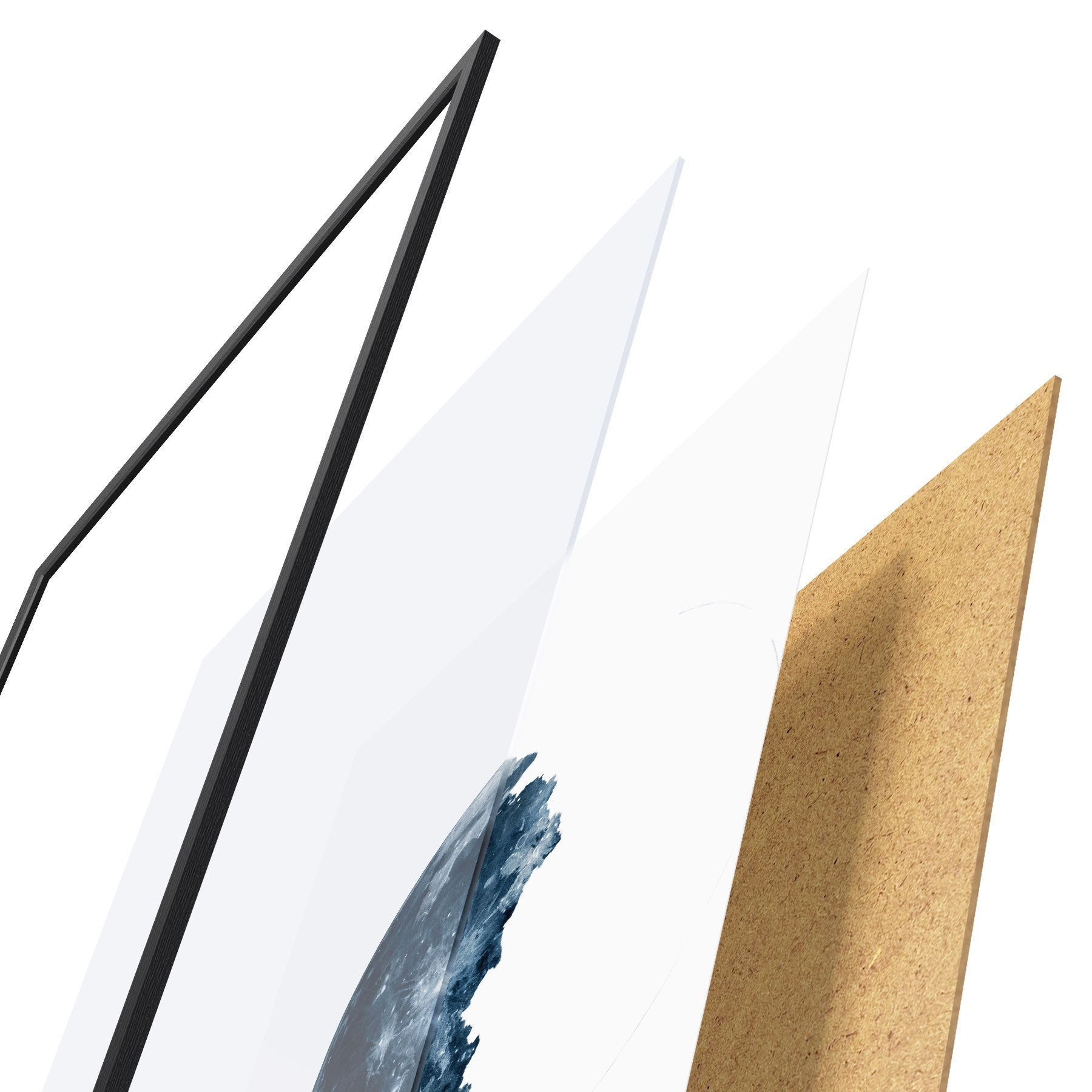 Das Poster besteht aus einem Rahmen, Plexiglas, einem gedruckten Bild und einer Rückwand aus Spanplatten. Dank der Halterungen auf der Rückseite kann das Poster sofort an die Wand gehängt werden.