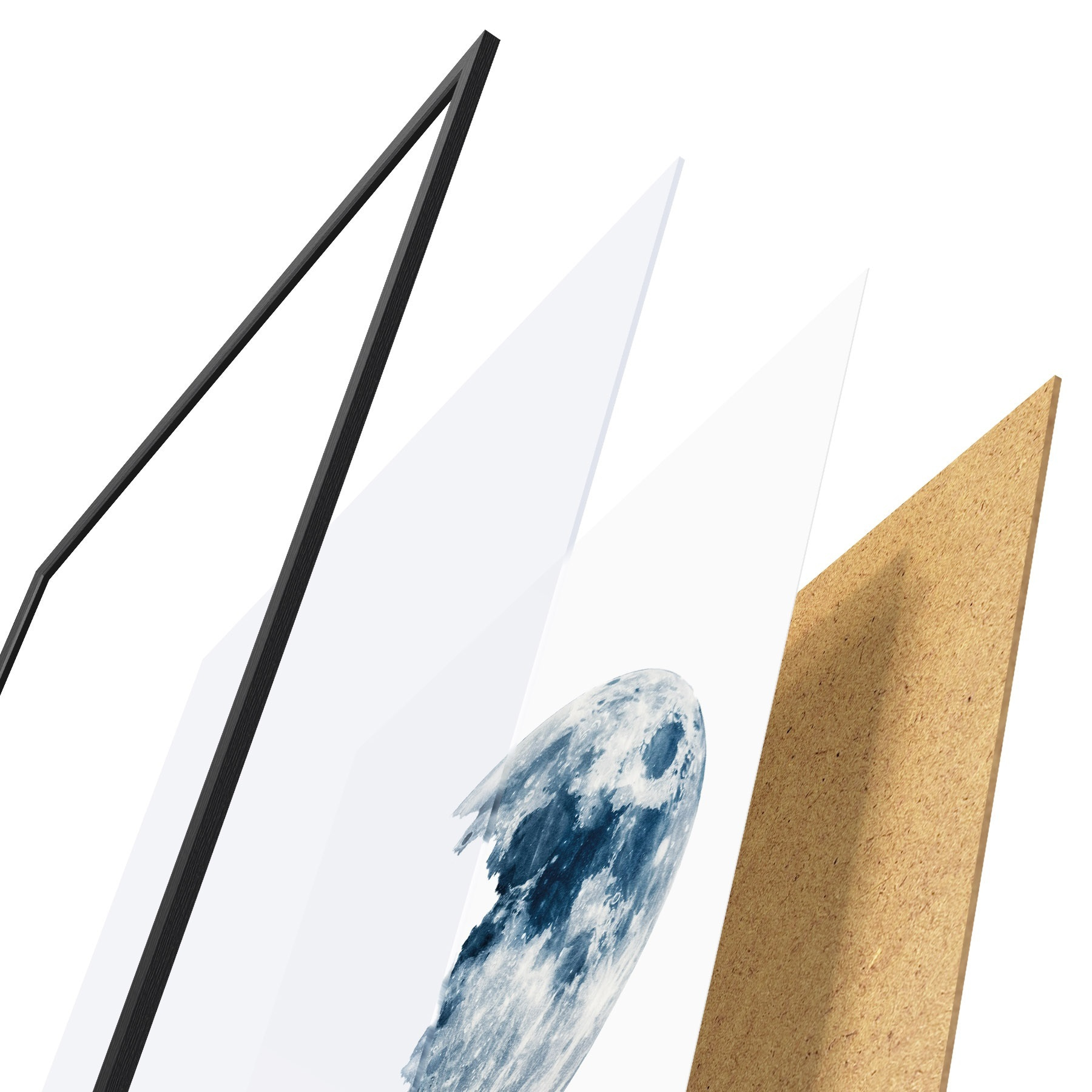 Das Poster besteht aus einem Rahmen, Plexiglas, einem gedruckten Bild und einer Rückwand aus Spanplatten. Dank der Halterungen auf der Rückseite kann das Poster sofort an die Wand gehängt werden.
