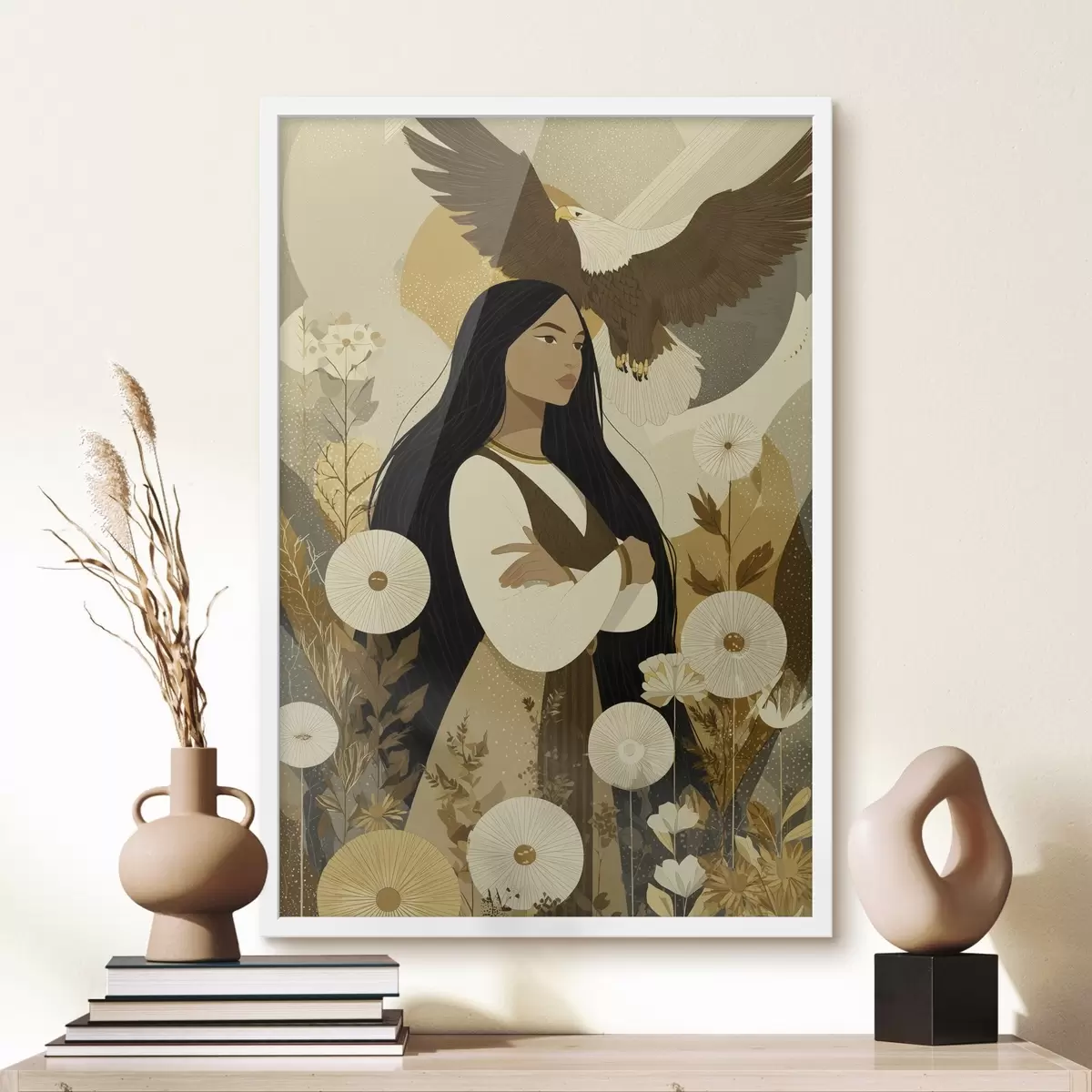 Poster Frau mit fliegendem Adler, Tribal-Stil, beige Farben f44977