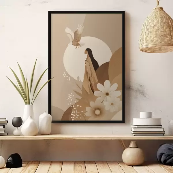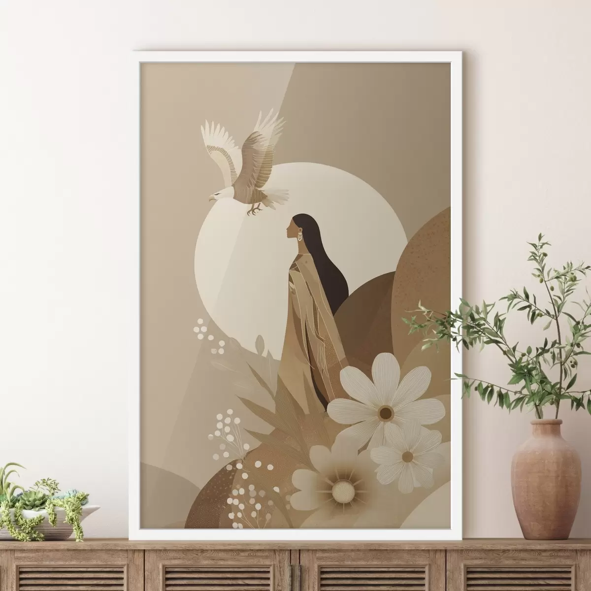 Poster Abstraktion mit Frau und Adler in den Himmel, beige Farben Nr f44978