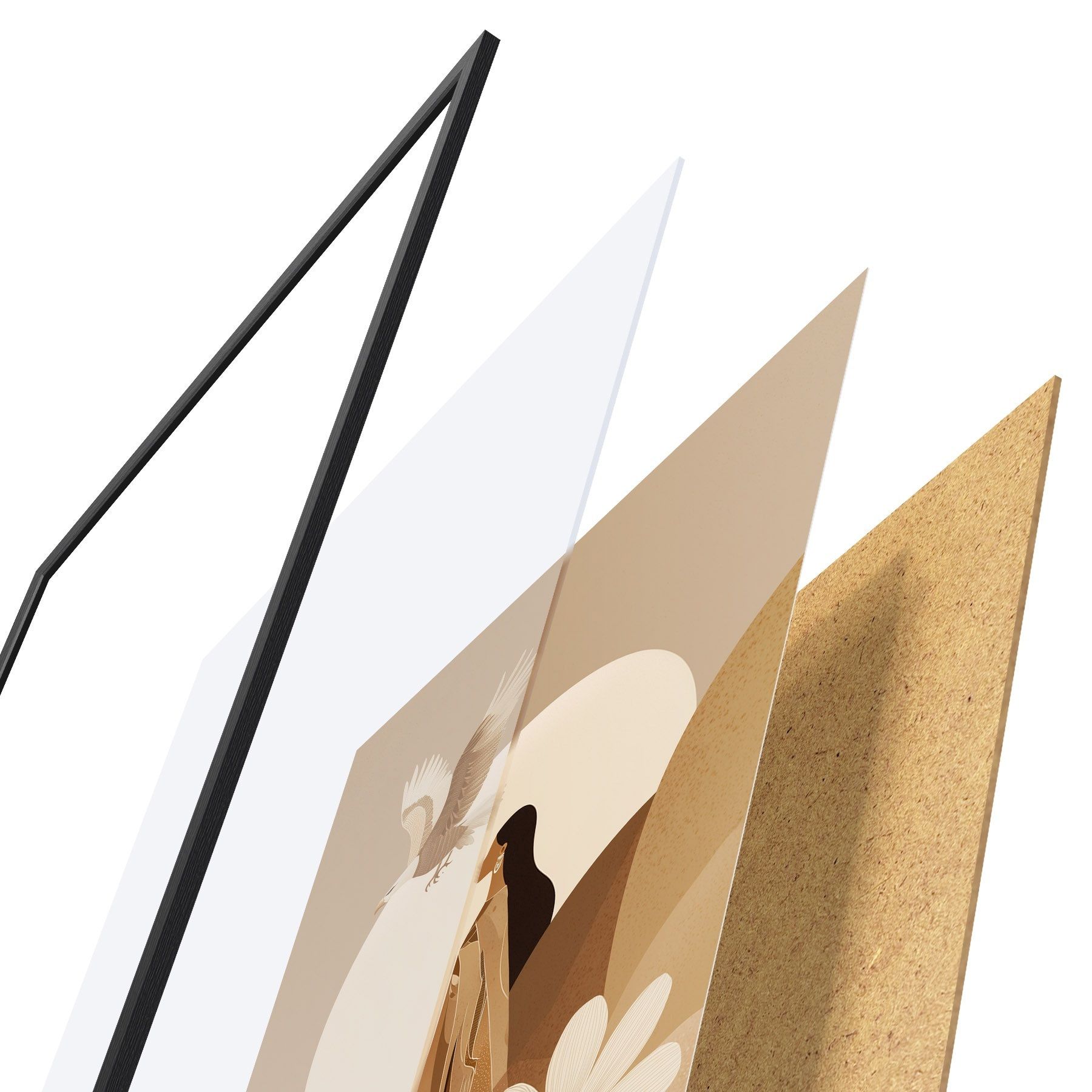 Das Poster besteht aus einem Rahmen, Plexiglas, einem gedruckten Bild und einer Rückwand aus Spanplatten. Dank der Halterungen auf der Rückseite kann das Poster sofort an die Wand gehängt werden.