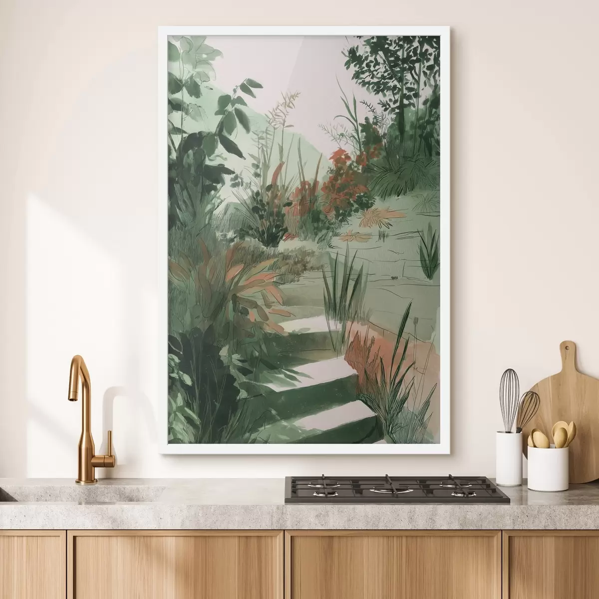 Poster Orientalischer Garten mit Büschen und Bäumen, grüne Farben Nr f44982