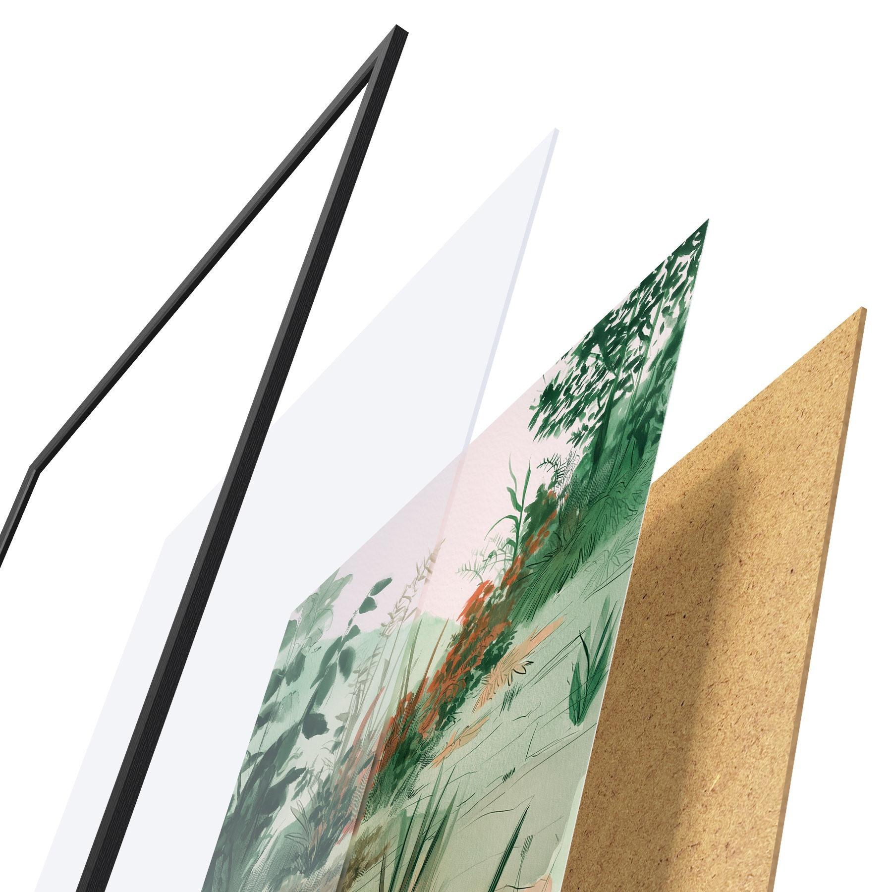 Das Poster besteht aus einem Rahmen, Plexiglas, einem gedruckten Bild und einer Rückwand aus Spanplatten. Dank der Halterungen auf der Rückseite kann das Poster sofort an die Wand gehängt werden.