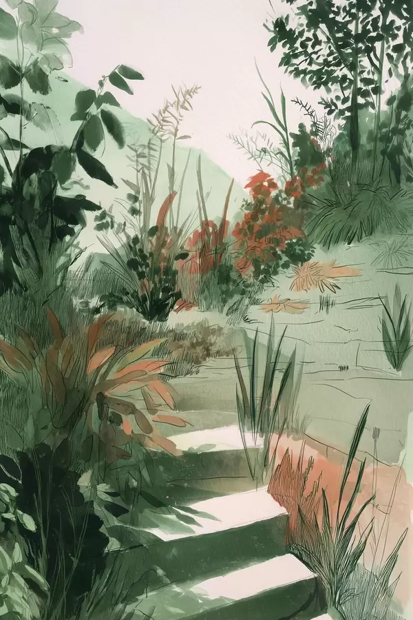 Poster Orientalischer Garten mit Büschen und Bäumen, grüne Farben Nr f44982