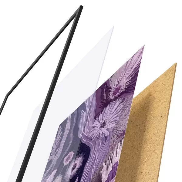 Das Poster besteht aus einem Rahmen, Plexiglas, einem gedruckten Bild und einer Rückwand aus Spanplatten. Dank der Halterungen auf der Rückseite kann das Poster sofort an die Wand gehängt werden.