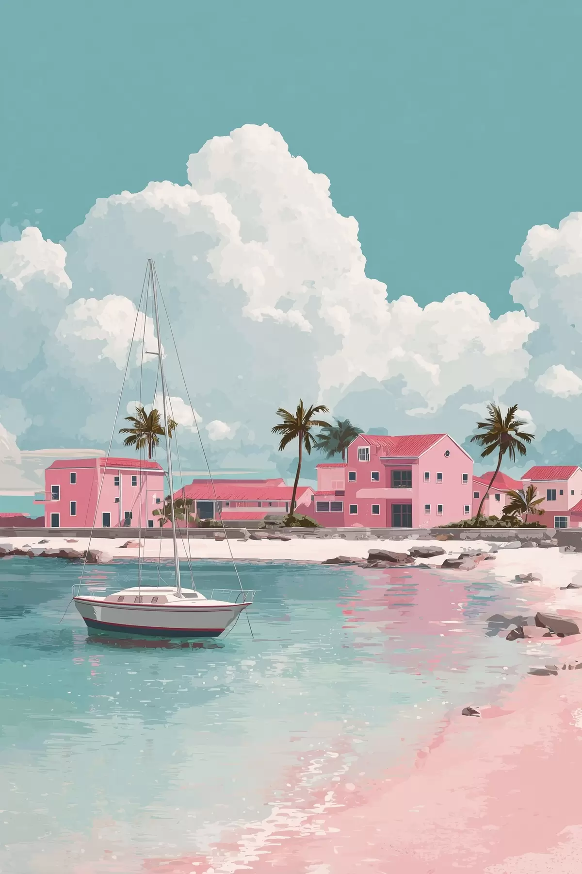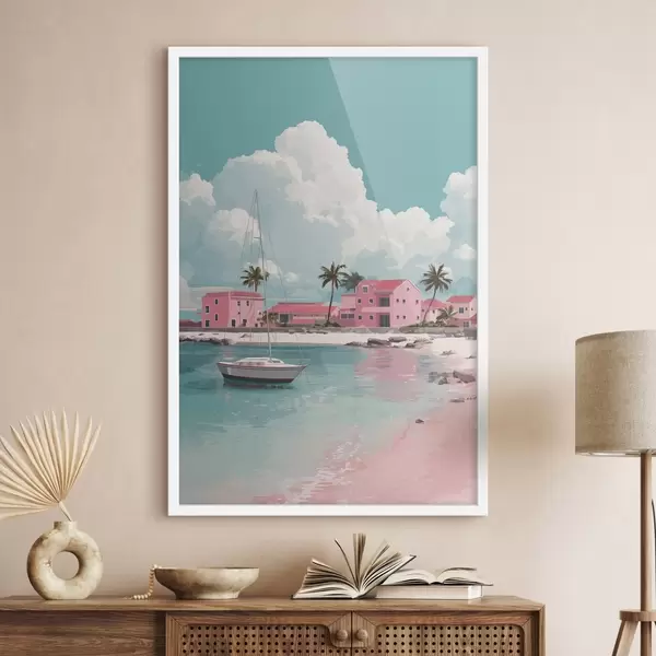 Poster Rosa Strand mit strahlendem Sonnenschein, Segelboot und Häusern f44986