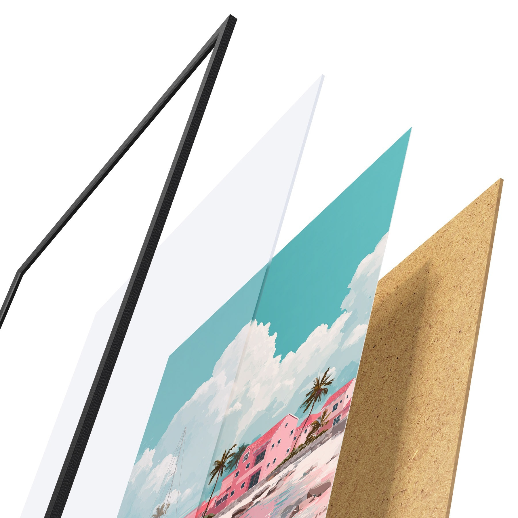 Poster Rosa Strand mit strahlendem Sonnenschein, Segelboot und Häusern Nr f44986