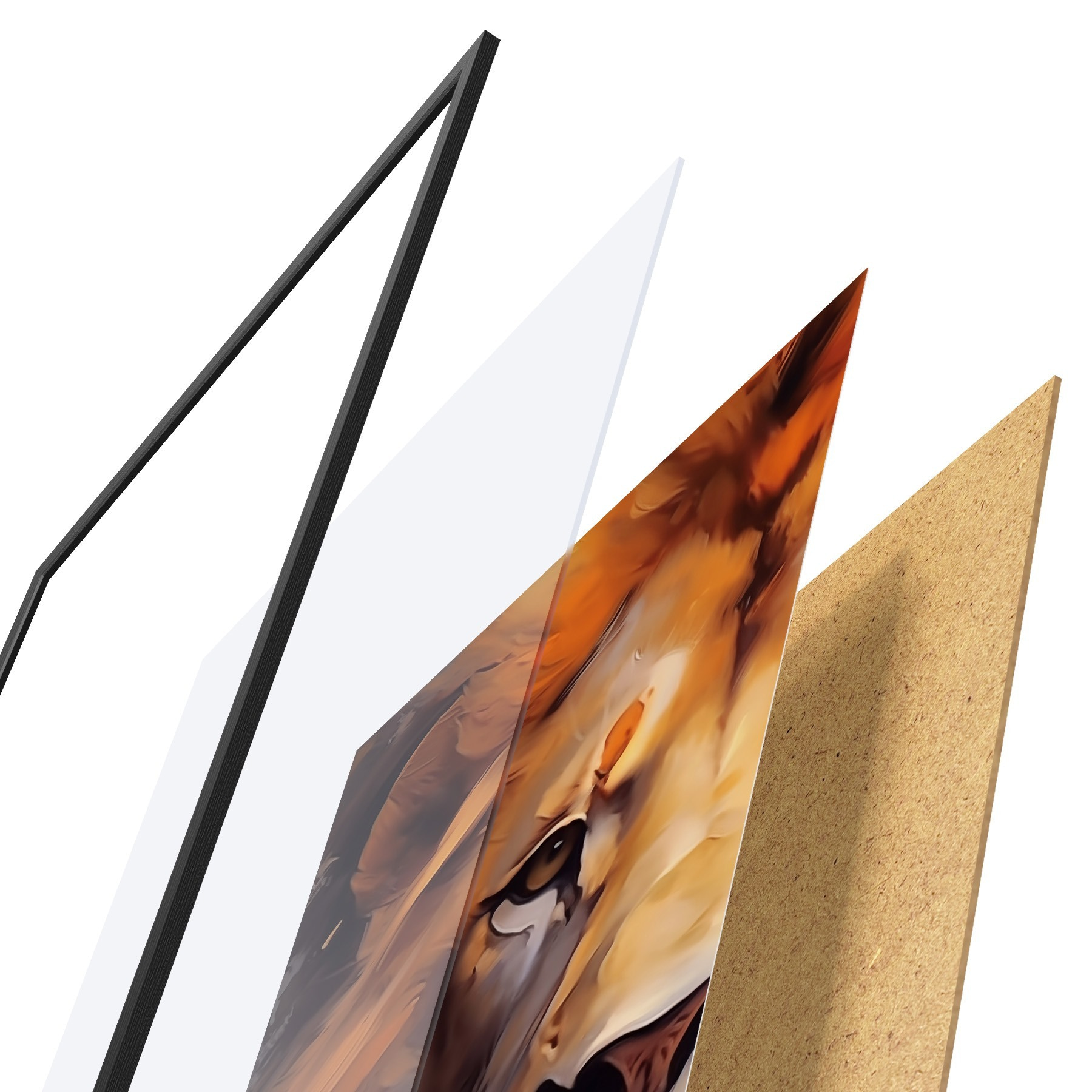 Das Poster besteht aus einem Rahmen, Plexiglas, einem gedruckten Bild und einer Rückwand aus Spanplatten. Dank der Halterungen auf der Rückseite kann das Poster sofort an die Wand gehängt werden.