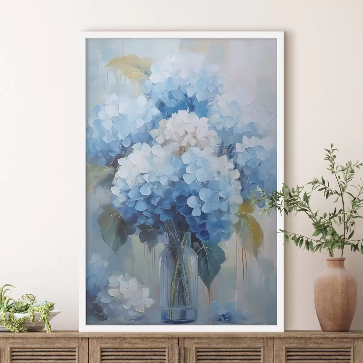 Poster Blumenstrauß aus blauen Hortensien in einer Glasvase Nr f44998