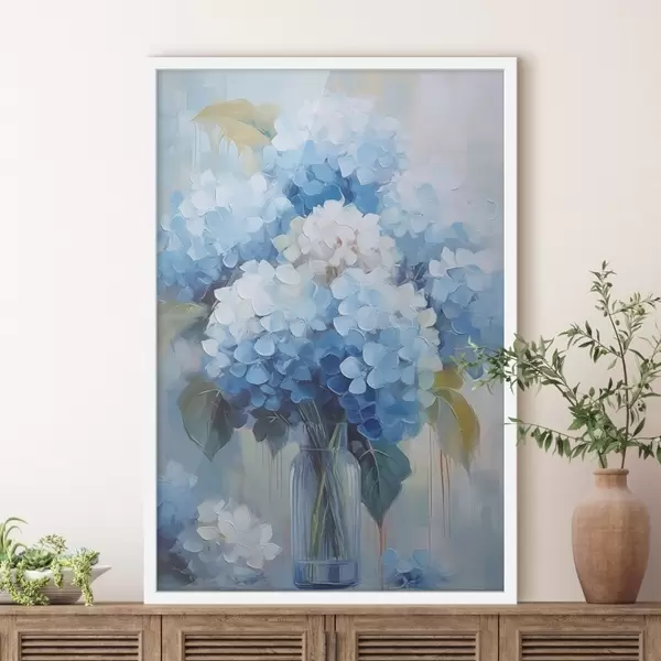 Poster Blumenstrauß aus blauen Hortensien in einer Glasvase f44998