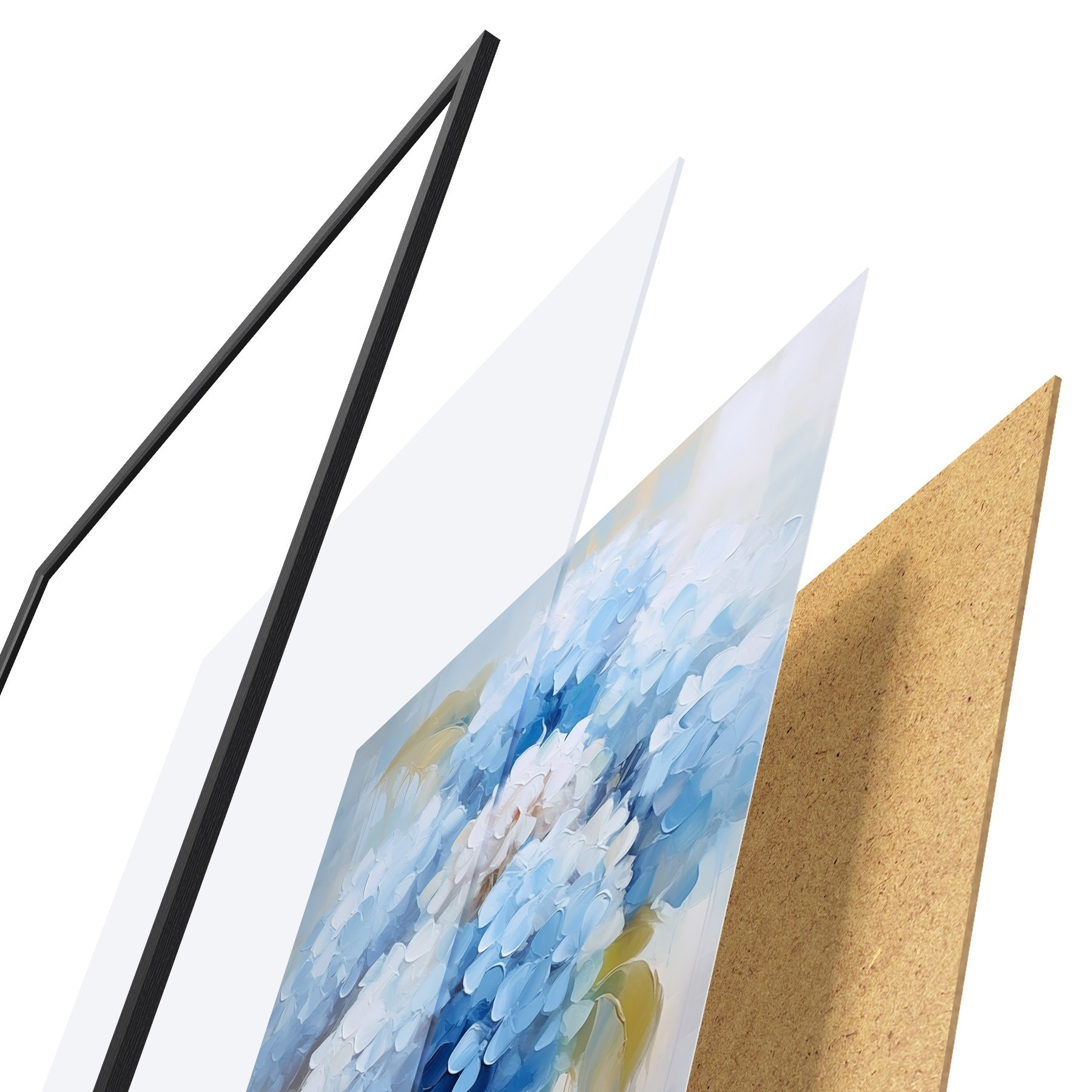 Das Poster besteht aus einem Rahmen, Plexiglas, einem gedruckten Bild und einer Rückwand aus Spanplatten. Dank der Halterungen auf der Rückseite kann das Poster sofort an die Wand gehängt werden.