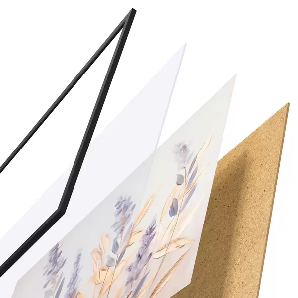 Das Poster besteht aus einem Rahmen, Plexiglas, einem gedruckten Bild und einer Rückwand aus Spanplatten. Dank der Halterungen auf der Rückseite kann das Poster sofort an die Wand gehängt werden.
