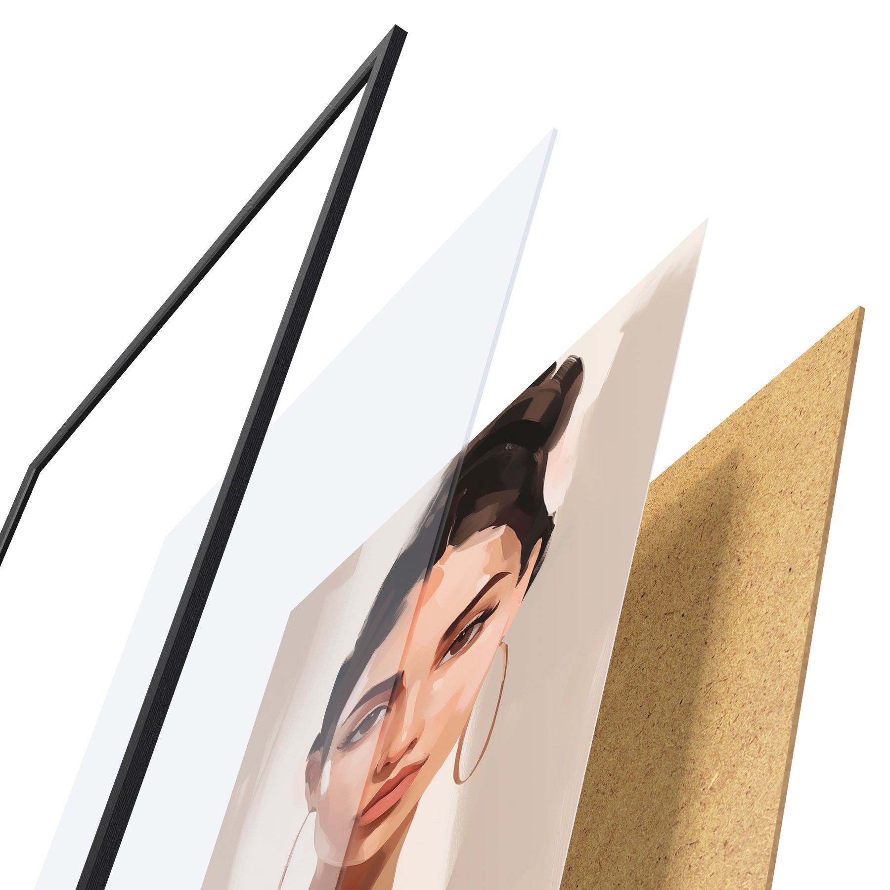 Das Poster besteht aus einem Rahmen, Plexiglas, einem gedruckten Bild und einer Rückwand aus Spanplatten. Dank der Halterungen auf der Rückseite kann das Poster sofort an die Wand gehängt werden.