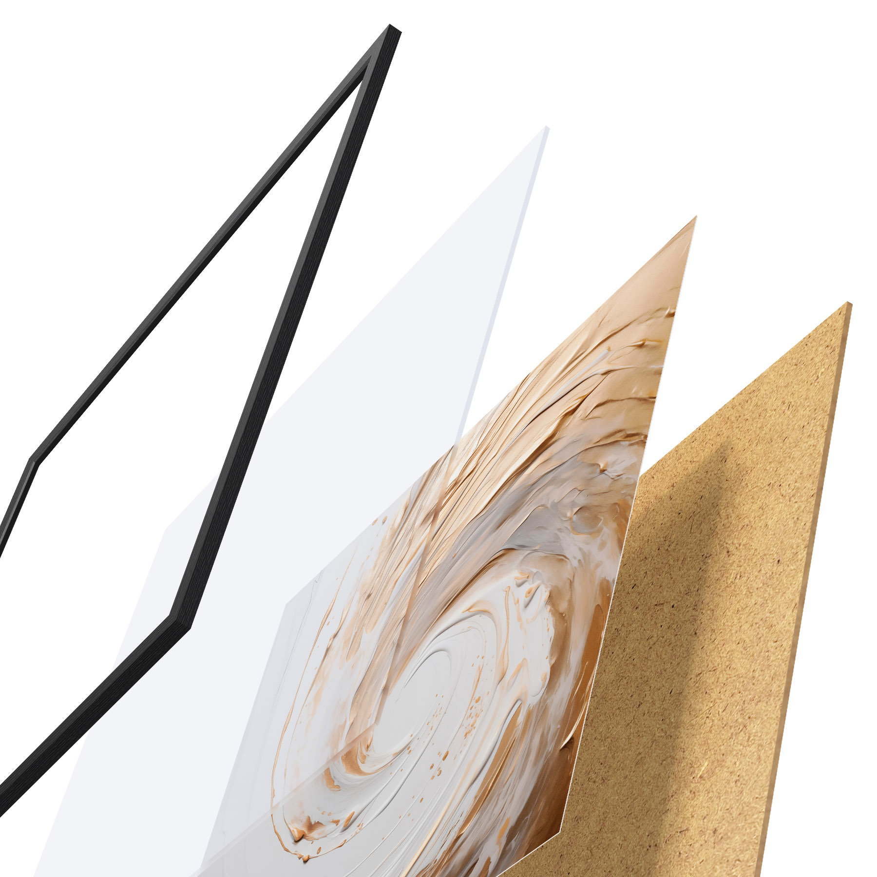 Das Poster besteht aus einem Rahmen, Plexiglas, einem gedruckten Bild und einer Rückwand aus Spanplatten. Dank der Halterungen auf der Rückseite kann das Poster sofort an die Wand gehängt werden.