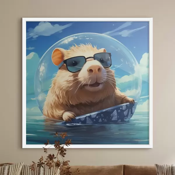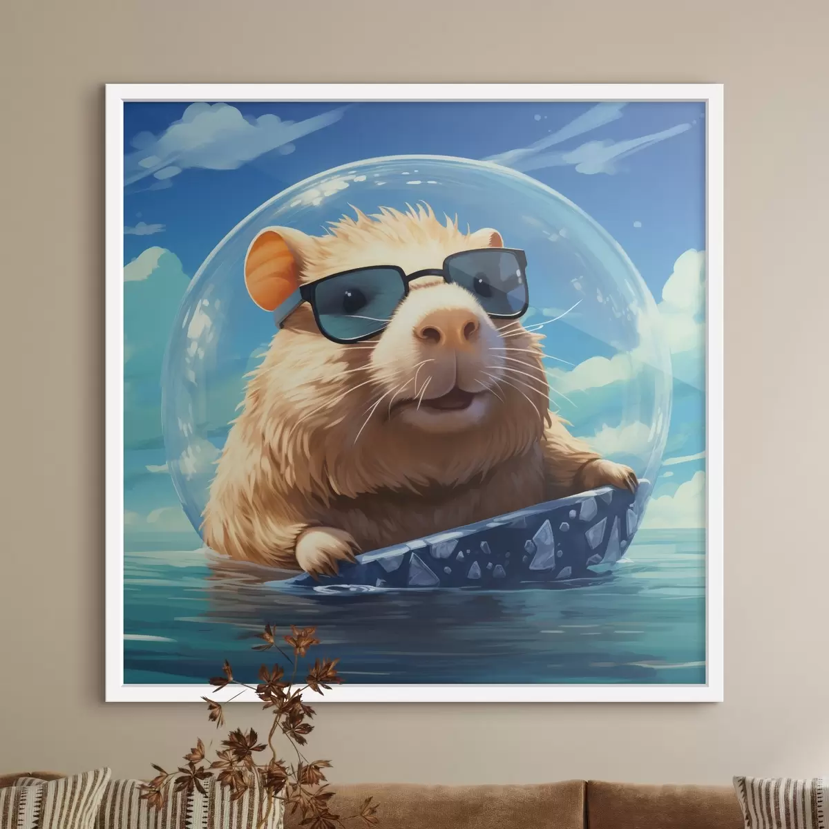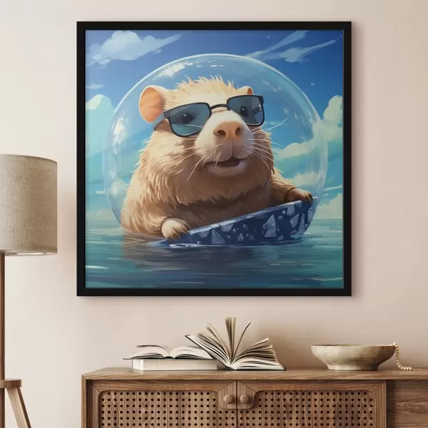 Poster Fröhliches Wasserschwein in einer durchsichtigen Blase auf dem Wasser f45029